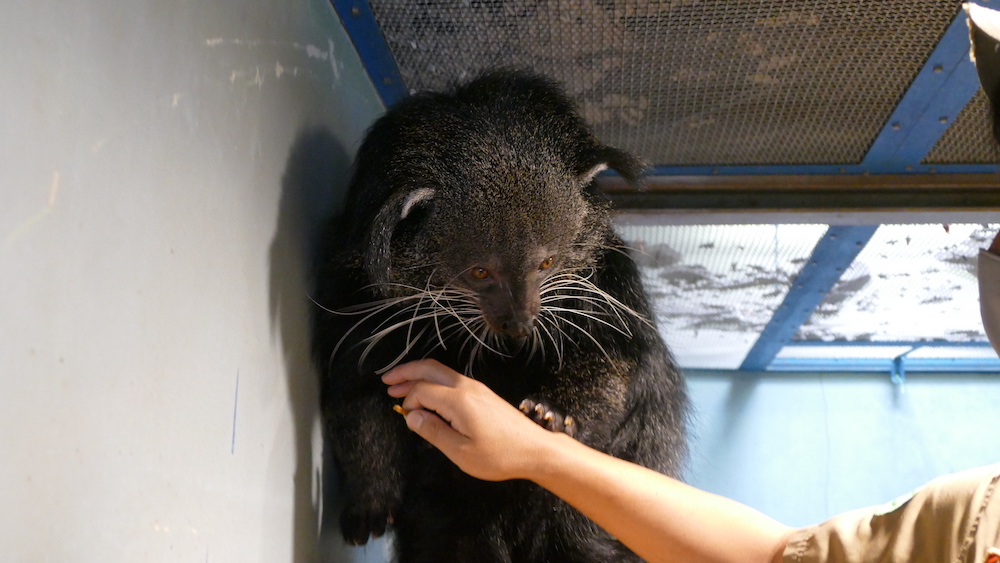 [su_note note_color=”#ffad2f” text_color=”#000000″]ビントロングは、爬虫類ではないのですが、アジアの熱帯雨林ゾーンができるまでの間、仮で爬虫館にいます。 アジアの熱帯雨林ゾーンは今年度完成予定です。[/su_note]