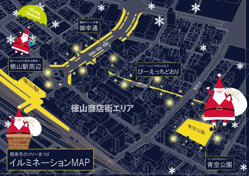 是非、徳山駅から御幸通ぴーえっちどおりと散策し、青空公園の色鮮やかなイルミネーションまでお楽しみください。