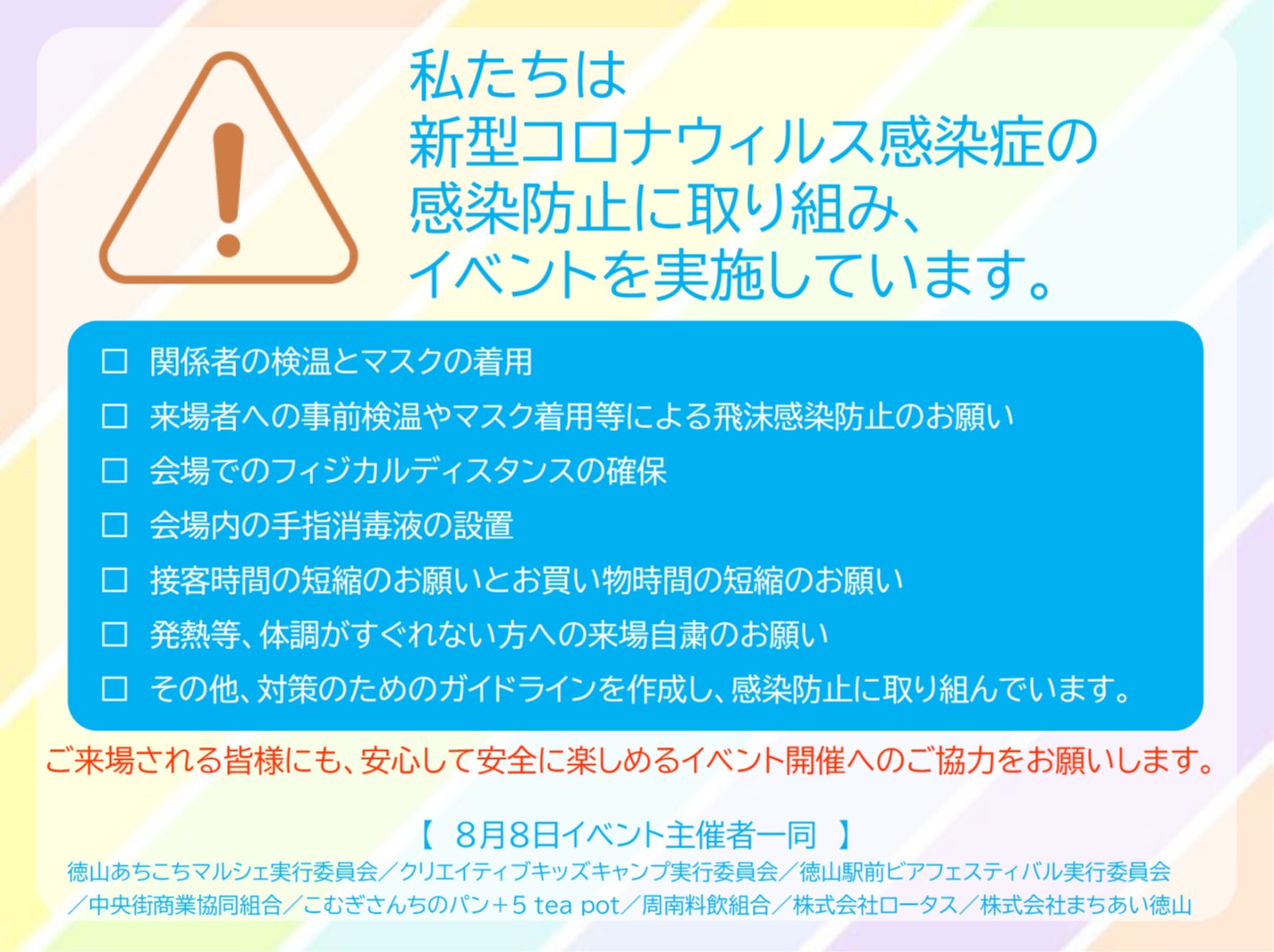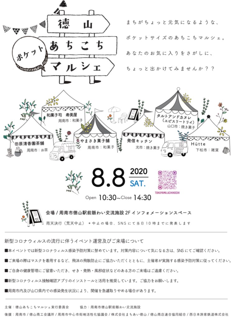 - 本イベントでは新型コロナウィルス感染予防対策に努めています。対策内容について気になる方は「徳山あちこちマルシェ」SNSにてご確認下さい。