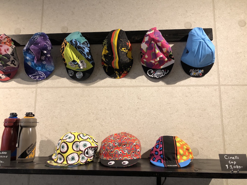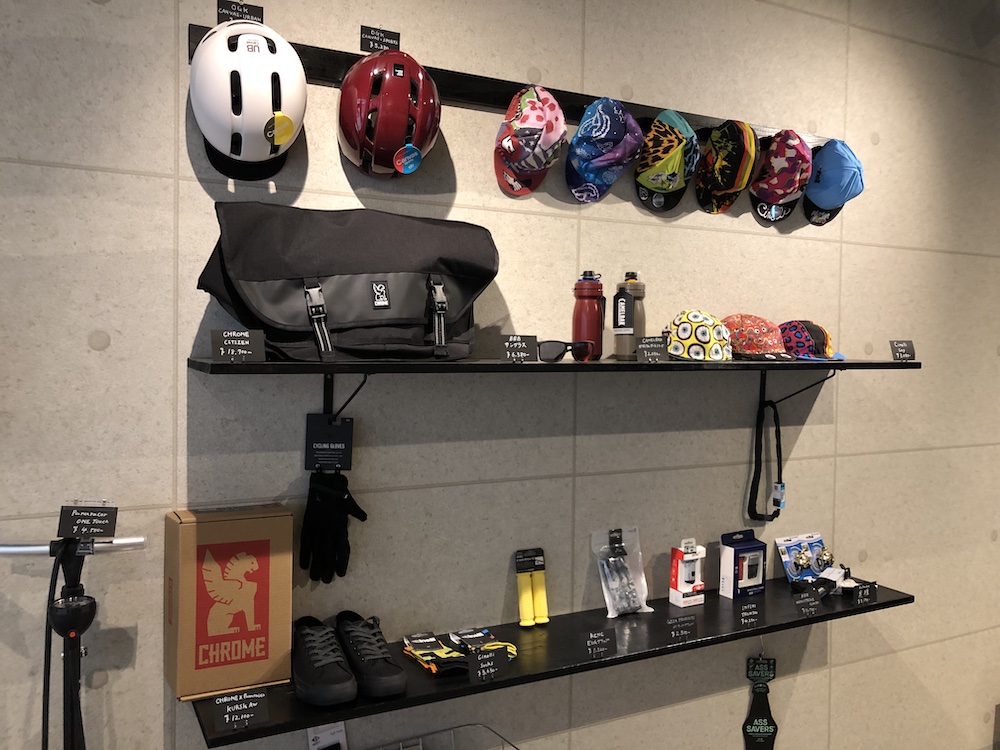 バイク以外に、カスタマイズグッズや帽子など店長さんオススメ商品も販売しています。