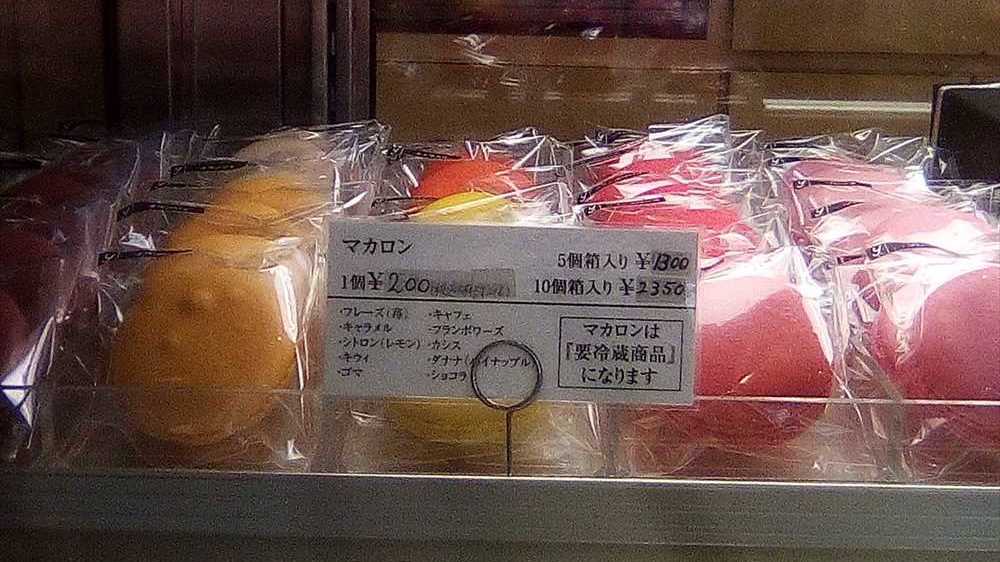 1個200円。味はフレーズ(苺)、キャラメル、シトロン(レモン)、キウイ、ゴマ、キャフェ、フランボワーズ、カシス、ダナナ(パイナップル)、ショコラ。5個箱入り1300円。10個箱入り2350円。