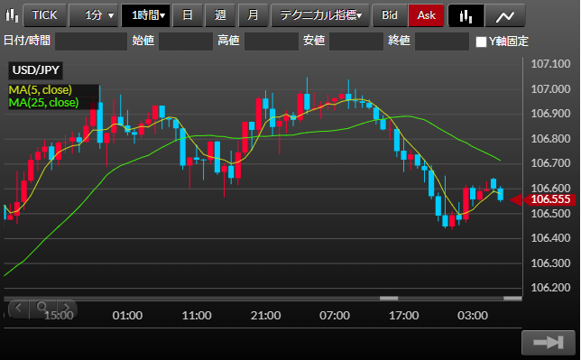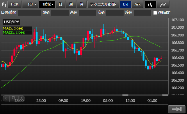 簡単に言うと為替チャートを見て今すぐこの通貨を買いたいor売りたい、そしてすぐに決済を行いたいときに使う注文方法になります。画面のように1:00からドルが上がってきているから、今すぐ買いたい、と思ったときに使えます。