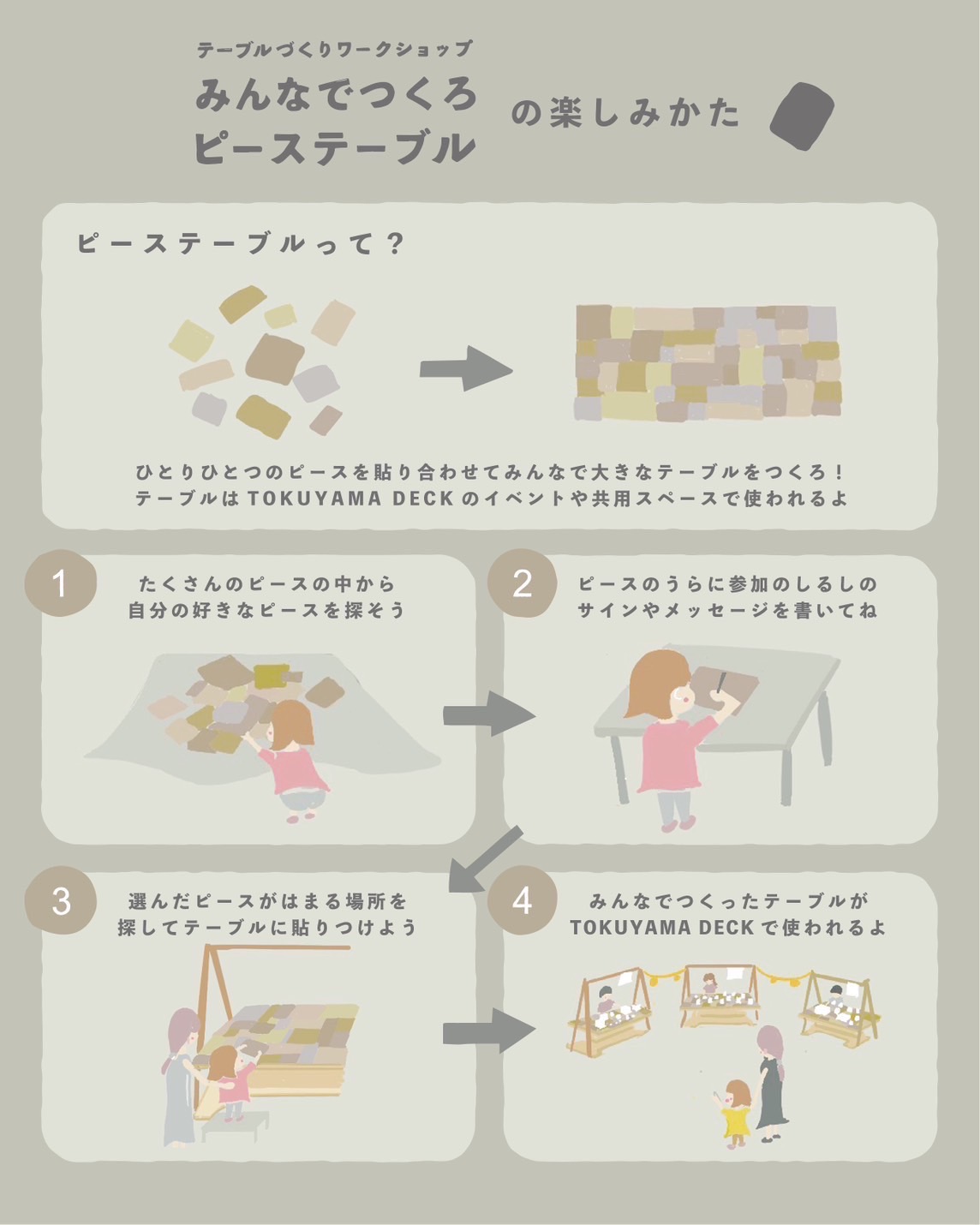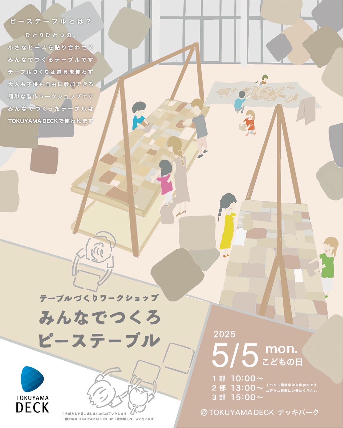 2025年5月5日(月、祝)のこどもの日に合わせて、テーブルづくりワークショップ「みんなでつくるピーステーブル」を開催いたします。