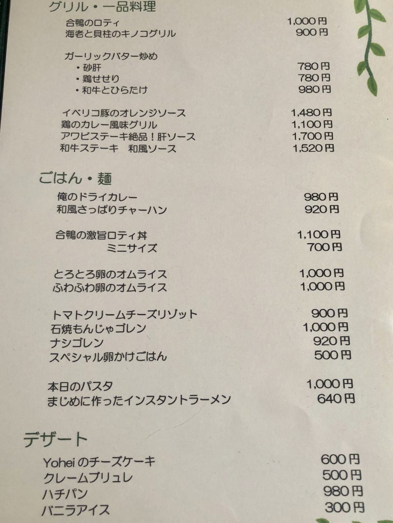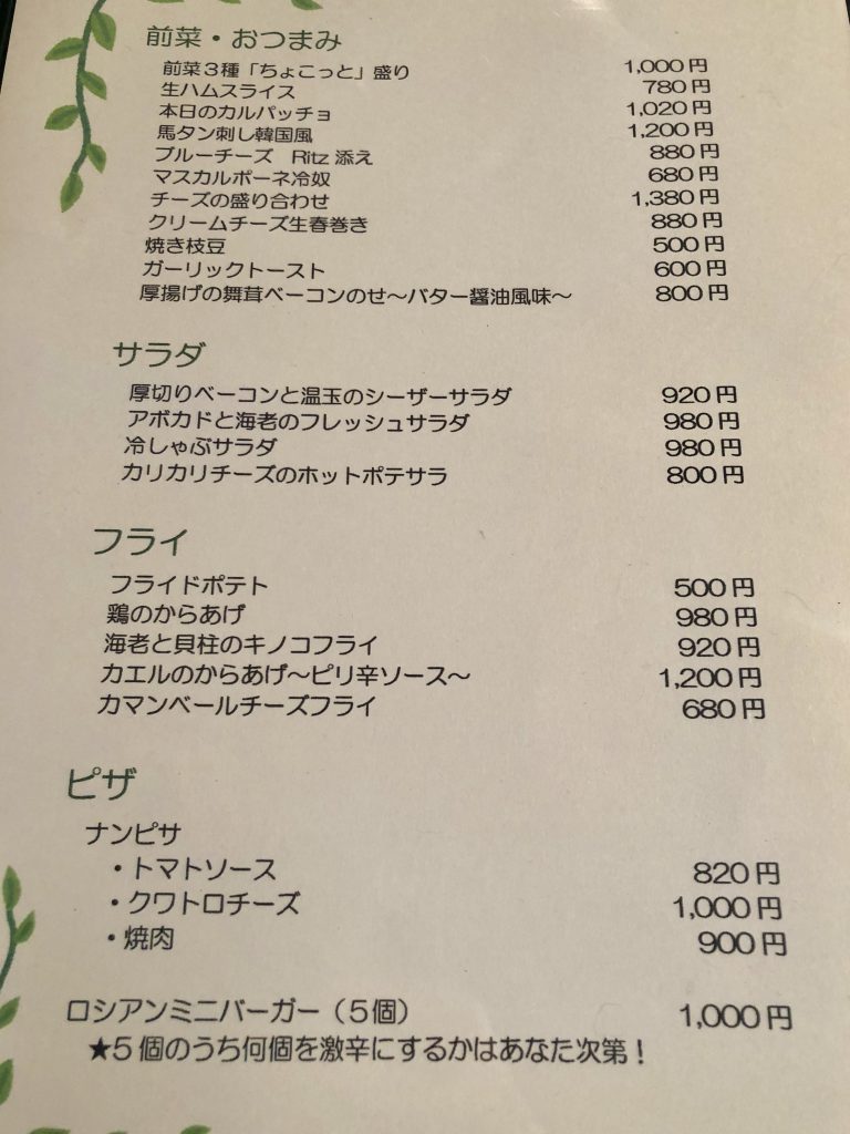 前菜からサラダ、揚げ物、一品料理、ご飯物やピザパスタ、デザートまで、幅広いラインナップ。ロシアンバーガー??まじめに作ったインスタントラーメン??などおもしろメニューもあり、遊び心溢れています。
