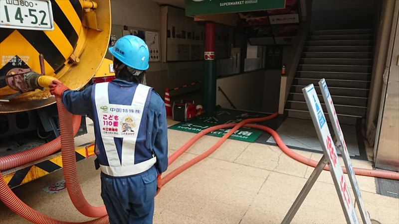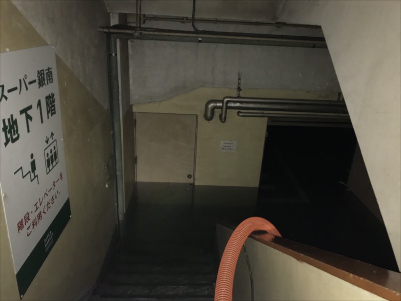 以来、文字通り夜を徹してのポンプ車による排水作業、関係者による復旧作業が進められました。地下の受電設備は銀南街1・2階店舗への配電を一手に引き受けていた重要な設備だけに、一週間後の7/29(月)には停電はまだ復旧していませんでした。