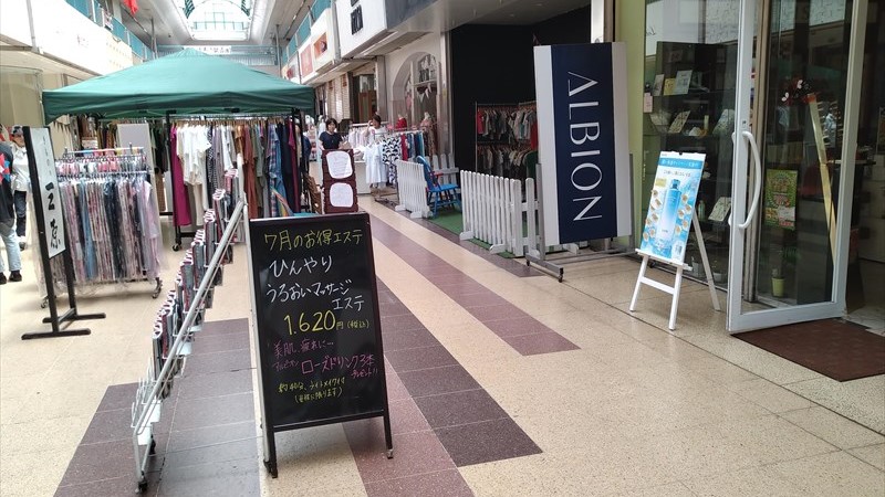 アーケード内にテントを設置、3店舗合同で「非常時青空マーケット」と銘打ったセール中!