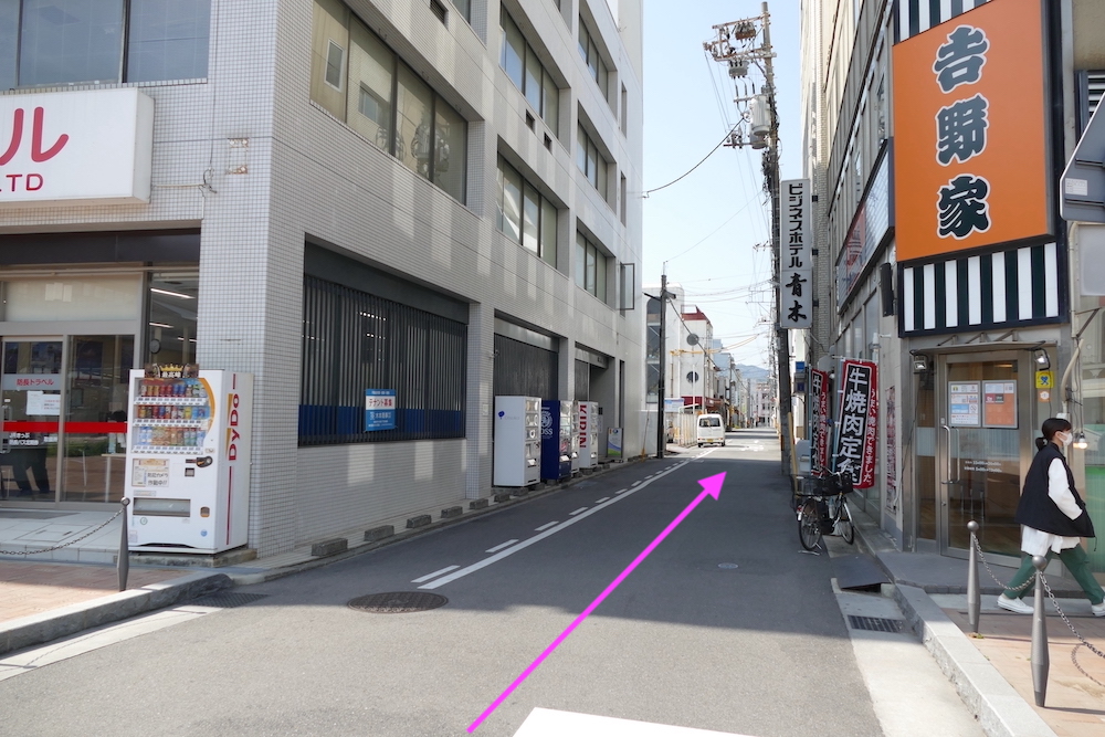 防長トラベルさんと吉野家さんの間の通りが『有楽町』になり、まっすぐ進みます。