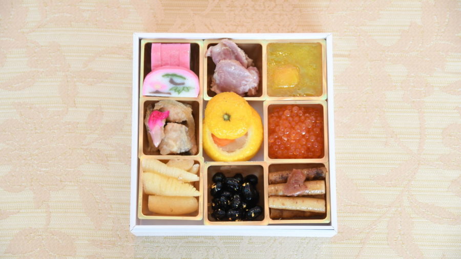 柚子釜(小鯛笹漬け紅白なます)、数の子、いくら醤油漬け、栗きんとん、砂肝コンフィ、たたき牛蒡(ごぼう)、黒豆の金箔落とし、鰤(ぶり)の南蛮漬け、紅白蒲鉾(かまぼこ) - 弐の重