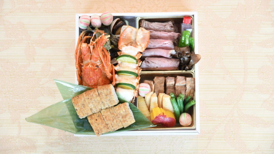 伊勢海老、山口県産姫栄螺海鮮焼き、手作りローストビーフ、熟成豚煮、竹の子、インゲン豆、手鞠麩、さつま煮、周南産自然薯蒲焼き