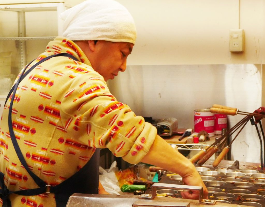 お店の前には、子どもからお年寄り、商店街の人がおやつに買いに来ていたりと、たいてい誰かが焼き立てを待っています。味は定番の5種類(つぶあん、白あん、カスタードクリーム、チーズクリーム、大名焼き)と、季節ごとに変わる3種類の8種類。中でも一番人気は、大名焼き!聞きなれない名前ですが、お好み焼きの具材が中身になったと思えばわかりやすいかも。甘くないので、ご飯の代わりや男性にもおすすめですよ。