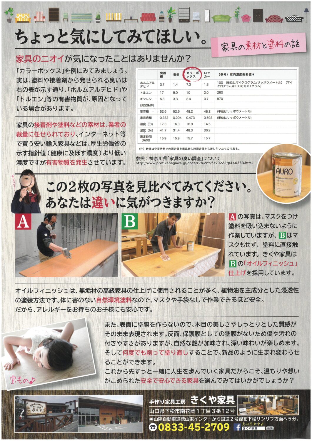うちの家具は、塗料や接着剤に化学物質を含まないので店内に嫌な臭いがしないと思います。