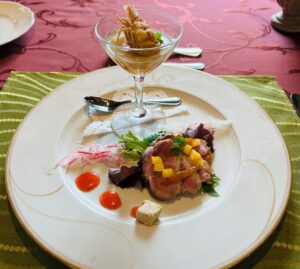 前菜 海老のカクテル風ジュレ 鴨ロース