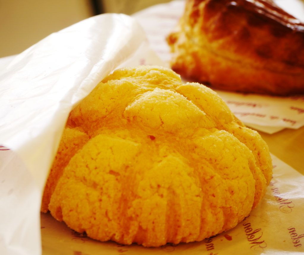 外はサクサク、中はふんわりの焼き立てメロンパン。アーモンドパウダーと焼いてカリカリになった砂糖が香ばしい。