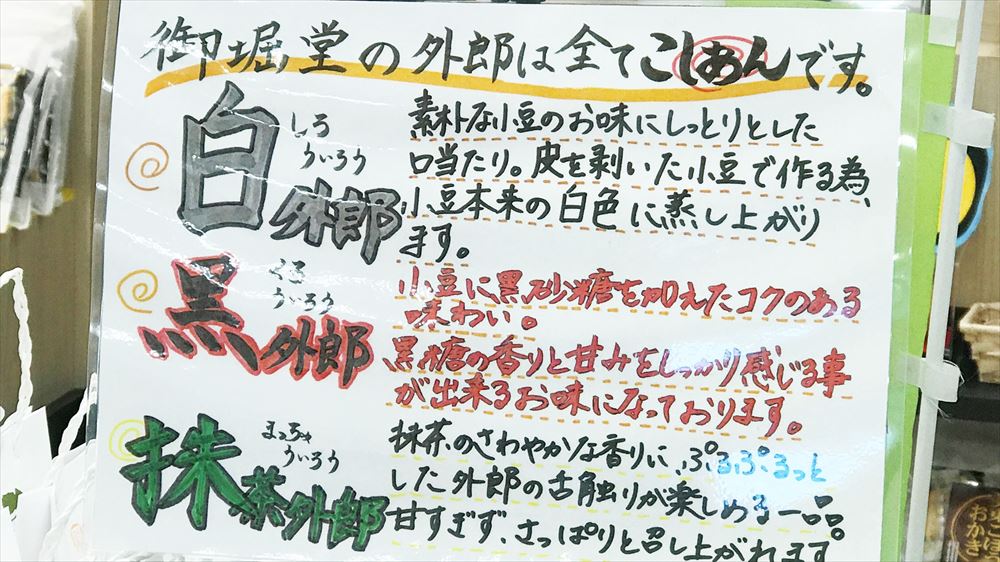 御堀堂の外郎、お味は白あん・黒あん・抹茶の3種類