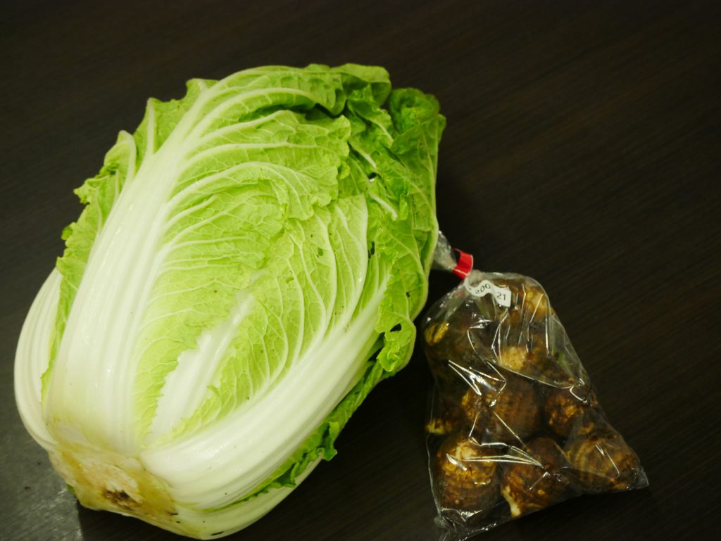 前回の朝市で買った白菜の立派なこと、そして里芋はねっとりほっこりの絶品でした。