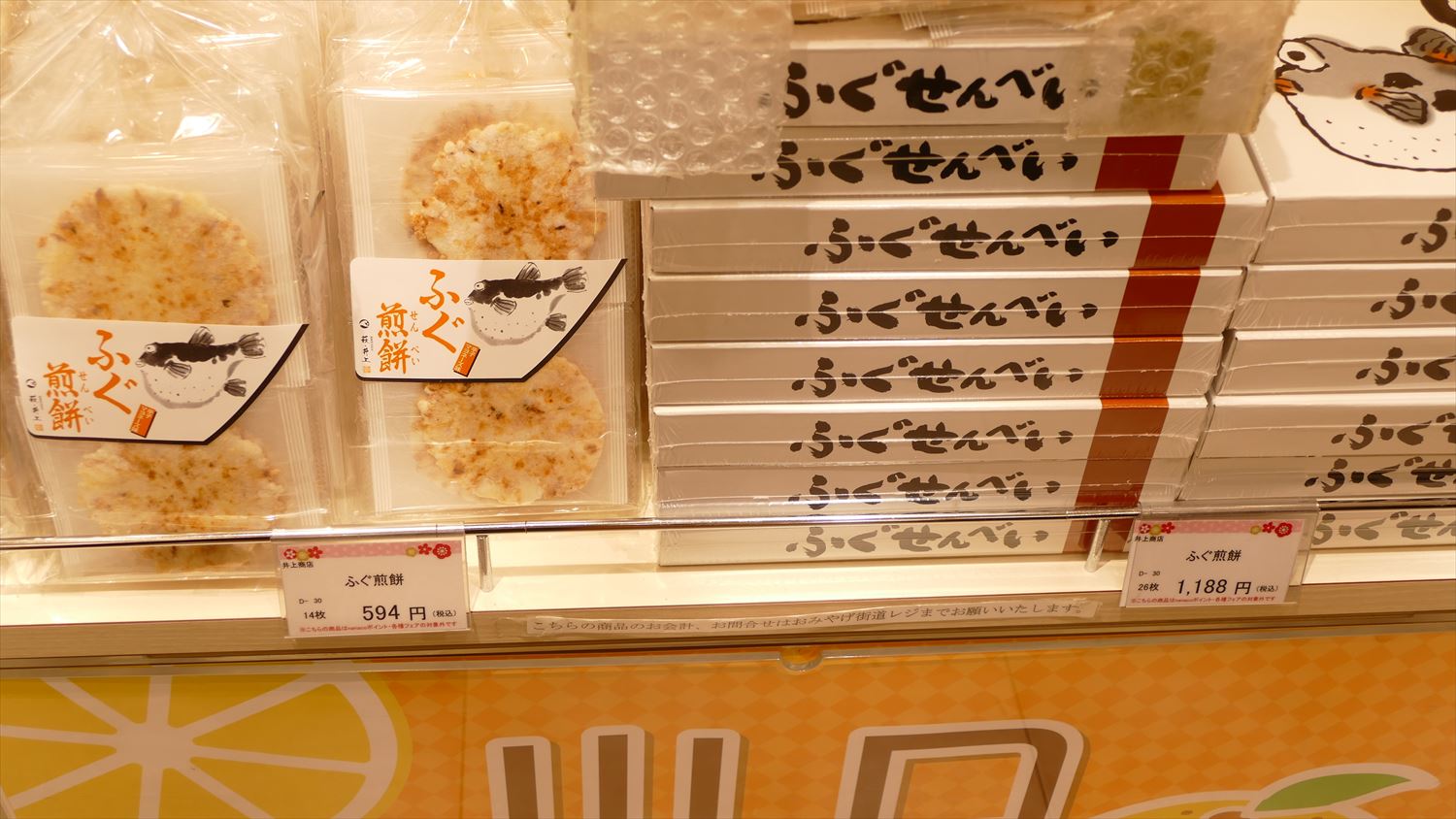 山口といえばフク(ふぐ)ということで、圧倒的定番人気はふぐせんべいです。辛子マヨネーズ味でしっかり味付けされているので食べ応えもばっちり。