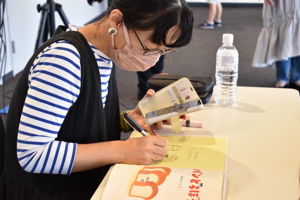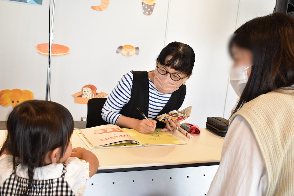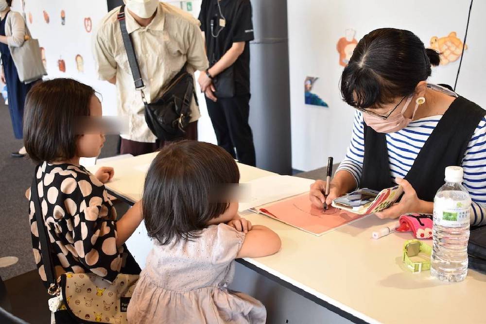 事前予約した親子20組限定で、柴田ケイコさんと直接お話しをしながら自身の絵本に似顔絵とサインを描いてもらえていました。