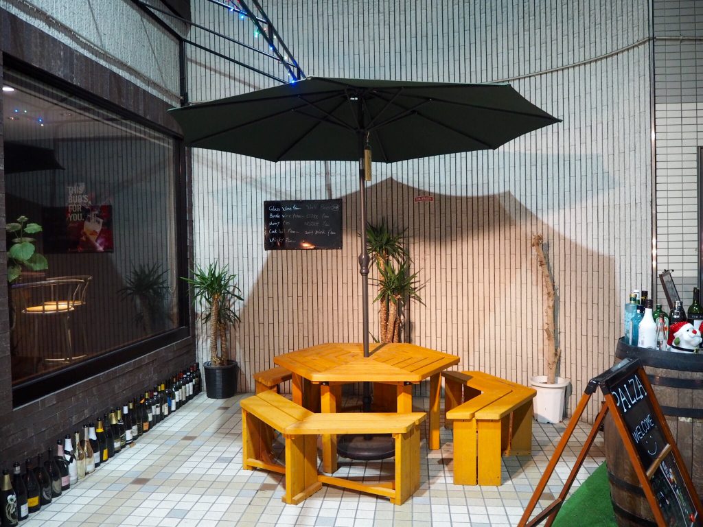 季節によっては、外で飲むのも乙ですね。テーブルをぐるっと囲むように座れるので、小団体さんにもオススメです。屋根+パラソルがあるので、雨の心配もないですよ!