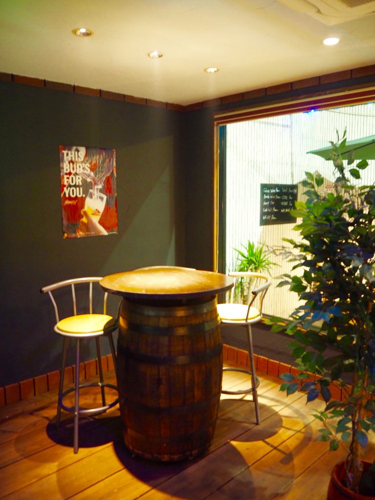 カウンターの手前にある、ちょっとした特別席。外国にいるような気分になれる樽のハイテーブルもオススメ。欧米風に、立ち飲みでわいわいしても、良いですね!