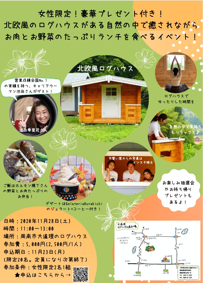 女性限定!豪華プレゼント付き!北欧風ログハウスのある自然の中で癒されながらお肉とお野菜のたっぷりランチを食べるイベント! 2020 11/05 2020年11月5日 URLをコピーする URLをコピーしました! 2025 Tokuyamapスペシャルサポーター \イベント情報やお得なキャンペーンをいち早く/★おともだち&フォロワー募集中★ TokuyamapLINE公式 Tokuyamap公式X 本記事内の情報は、取材当時に確認をした内容でございます。詳しくは各施設・団体などへお問い合わせください。 大自然の中にある、可愛い北欧風ログハウスで行う女性限定の豪華なイベント! イベントの詳細や申し込みについては、イベント情報よりご確認ください。 みなさまのご参加を心よりお待ちしております。 本記事内の情報は、取材当時に確認をした内容でございます。詳しくは各施設・団体などへお問い合わせください。 この記事が気に入ったら いいね または フォローしてね! Follow @tokuyamap Follow Me よかったらシェアしてね! URLをコピーする URLをコピーしました! URLをコピーしました! 周南三蔵入賞酒で「秋を味わう会」 第3回新商品・新サービス合同プレス発表会 この記事を書いた人 貞本 麻喜 動物大好き! この著者の記事一覧へ 関連記事 ゆめタウン徳山店で開催!周南市の“おいしい”が、ぎゅ~っと詰まった!地域産品フェア 2020年10月8日 周南市のバスや電車などの公共交通の魅力をお伝えするフリーペーパー「notta!」 2023年1月31日 駅近弁(駅に近い弁当) 2020年6月10日 周南きさらぎ文化祭 2021年1月27日 Let’s SDGs ~できることからはじめよう~ in seahorse 2021年4月9日 【まちのポートワークショップ クリスマスリースをつくろう!】 2021年11月26日 園児と小学一年生を対象 HALLOWEENパーティー🎃 2020年10月2日 遠石会館【新商品】お醤油シリーズ 2020年11月30日 \周南の新情報提供お待ちしています!/★おともだち&フォロワー募集中★ TokuyamapLINE公式 Tokuyamap公式X