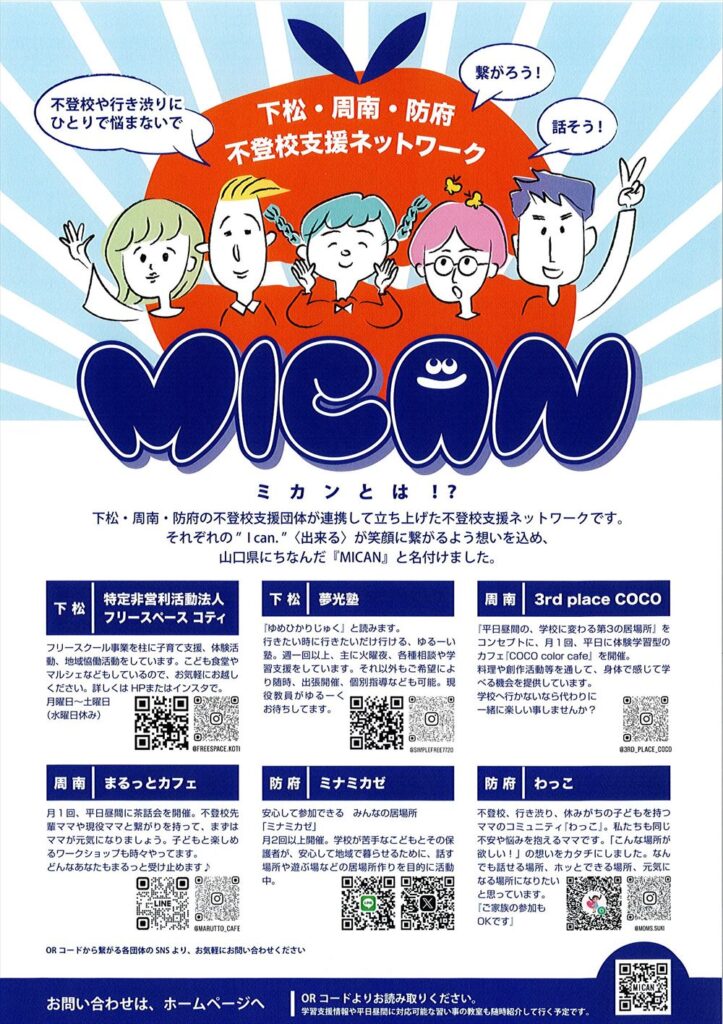 下松・周南・防府 不登校支援ネットワーク MICAN(ミカン) 2024 11/22 2024年11月22日 URLをコピーする URLをコピーしました! 2025 Tokuyamapスペシャルサポーター \イベント情報やお得なキャンペーンをいち早く/★おともだち&フォロワー募集中★ TokuyamapLINE公式 Tokuyamap公式X 本記事内の情報は、取材当時に確認をした内容でございます。詳しくは各施設・団体などへお問い合わせください。 本記事内の情報は、取材当時に確認をした内容でございます。詳しくは各施設・団体などへお問い合わせください。 この記事が気に入ったら いいね または フォローしてね! Follow @tokuyamap Follow Me よかったらシェアしてね! URLをコピーする URLをコピーしました! URLをコピーしました! 周南市自動運転EVバス実証運行 2025年 JLPGAステップアップツアー山口周南レディースカップ この記事を書いた人 箭内 奈津美 Tokuyamap編集長。2018年に東京から移住してきました! 地元の方とは違う目線で街の魅力を見つけていきます。 この著者の記事一覧へ 関連記事 COILプロジェクト第1段【COIL Upcycle Art Contest】始動 2021年4月28日 「徳山駅前 グルメ豆本」を4月30日に発刊 2020年4月20日 写真と書の共同アート「美雅」 2020年7月9日 民間学童保育アクスキッズ 2023年度新規入会募集説明会 2022年9月28日 周南市産のトマトの利用促進を目的とした「周南トマトメニューフェア」を開催 2021年2月8日 「♯周南ほろよい便」 2020年6月18日 ゴールデンウィークは安心の日帰りバスツアーで! 2021年3月29日 2025年 JLPGAステップアップツアー山口周南レディースカップ 2025年11月10日 \周南の新情報提供お待ちしています!/★おともだち&フォロワー募集中★ TokuyamapLINE公式 Tokuyamap公式X