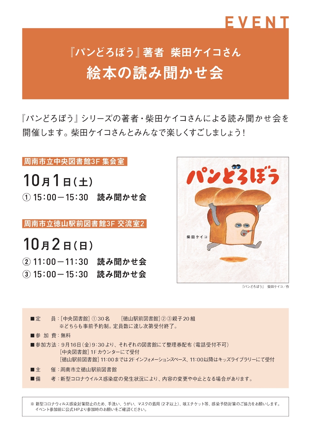 このたび、『パンどろぼう』著者 柴田ケイコさん 絵本の読み聞かせ会を10月2日(日)に開催いたしますことをお知らせいたします。