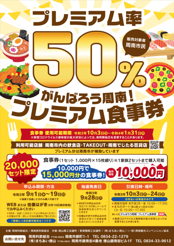 [su_button url=”https://shunan-premium.com” target=”blank” background=”#f0d530″ color=”#000000″ size=”10″ center=”yes” icon=”icon: hand-o-right”]【がんばろう周南!プレミアム食事券 公式サイト】[/su_button]