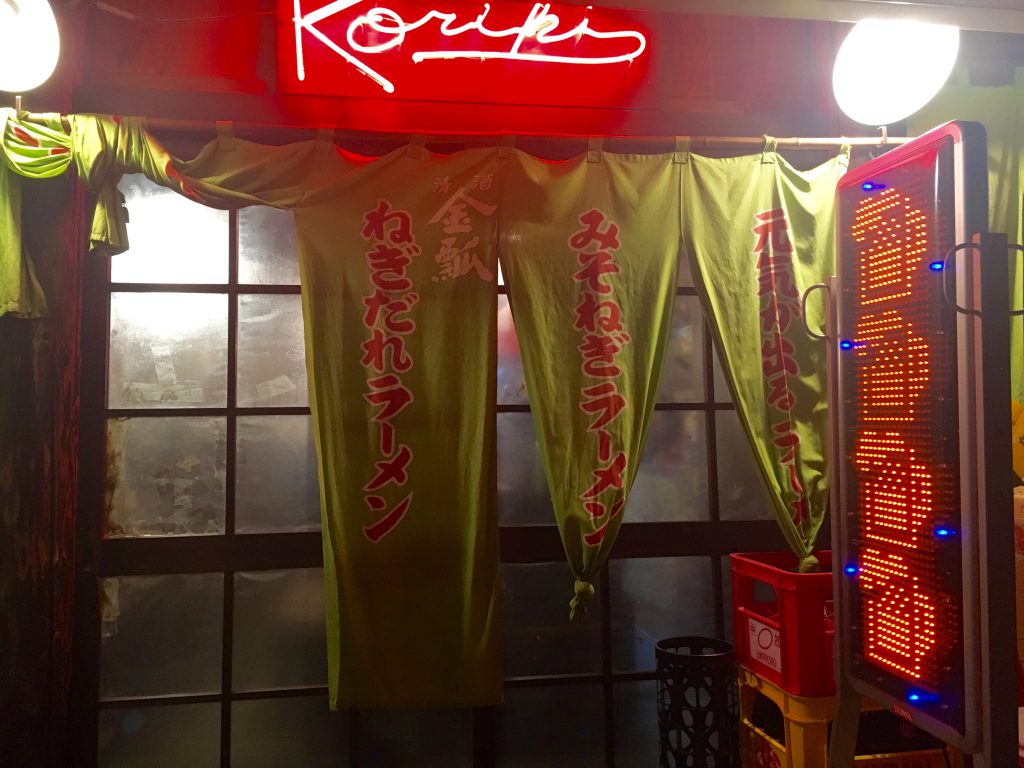 ネギ色の暖簾と、ネオン、LED看板が目印!