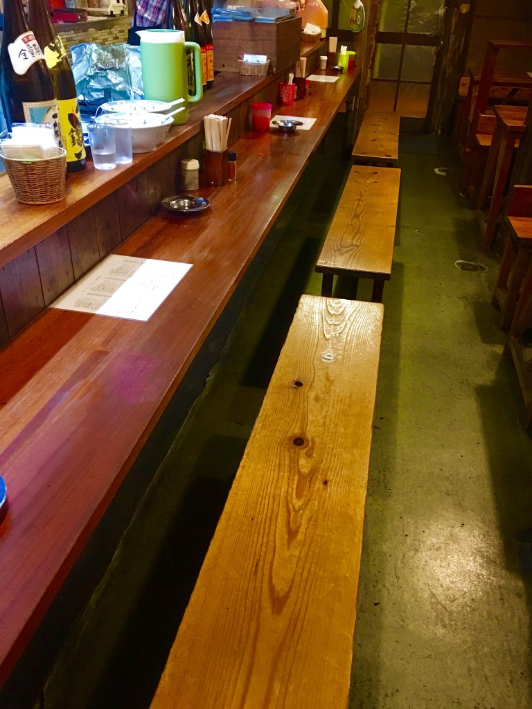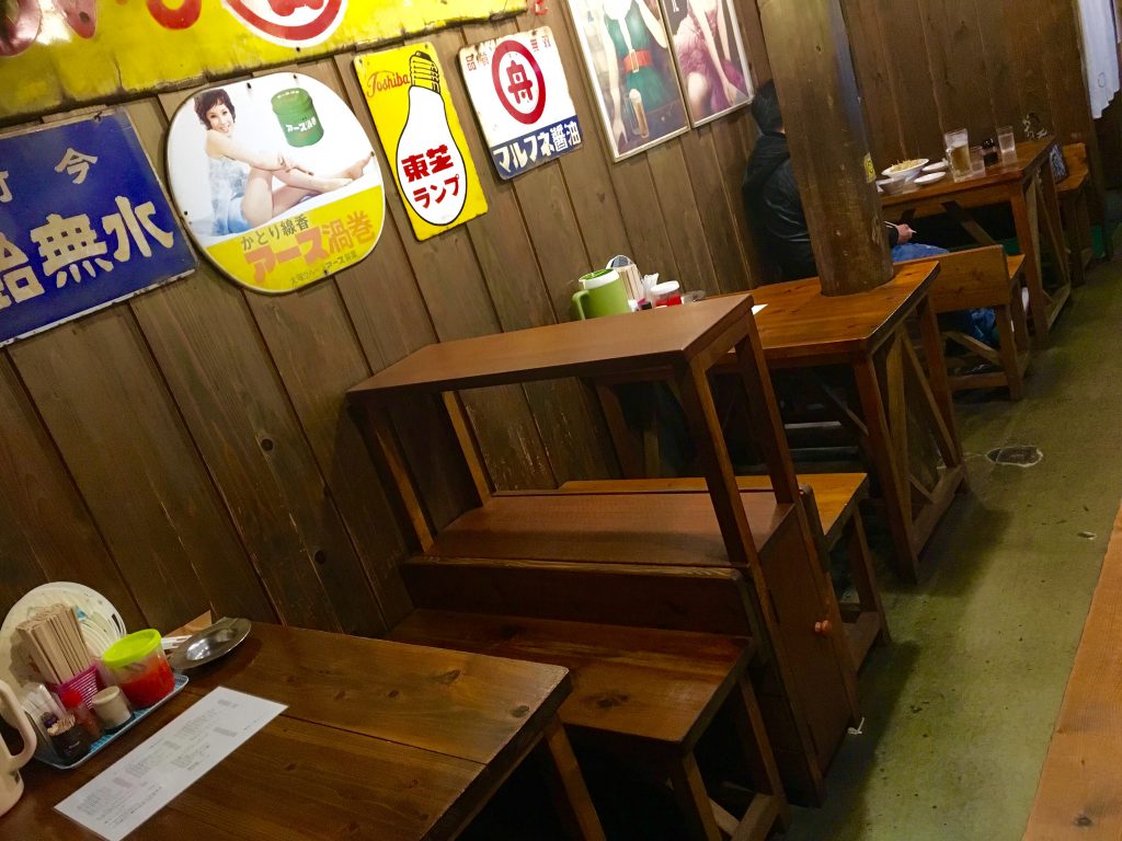 店内に入ると、ラーメンを啜る音と共に、「懐かし〜」と思わず言ってしまうBGMが聞こえます。4名がけのテーブル席3つと、長いカウンターがずらーっ。