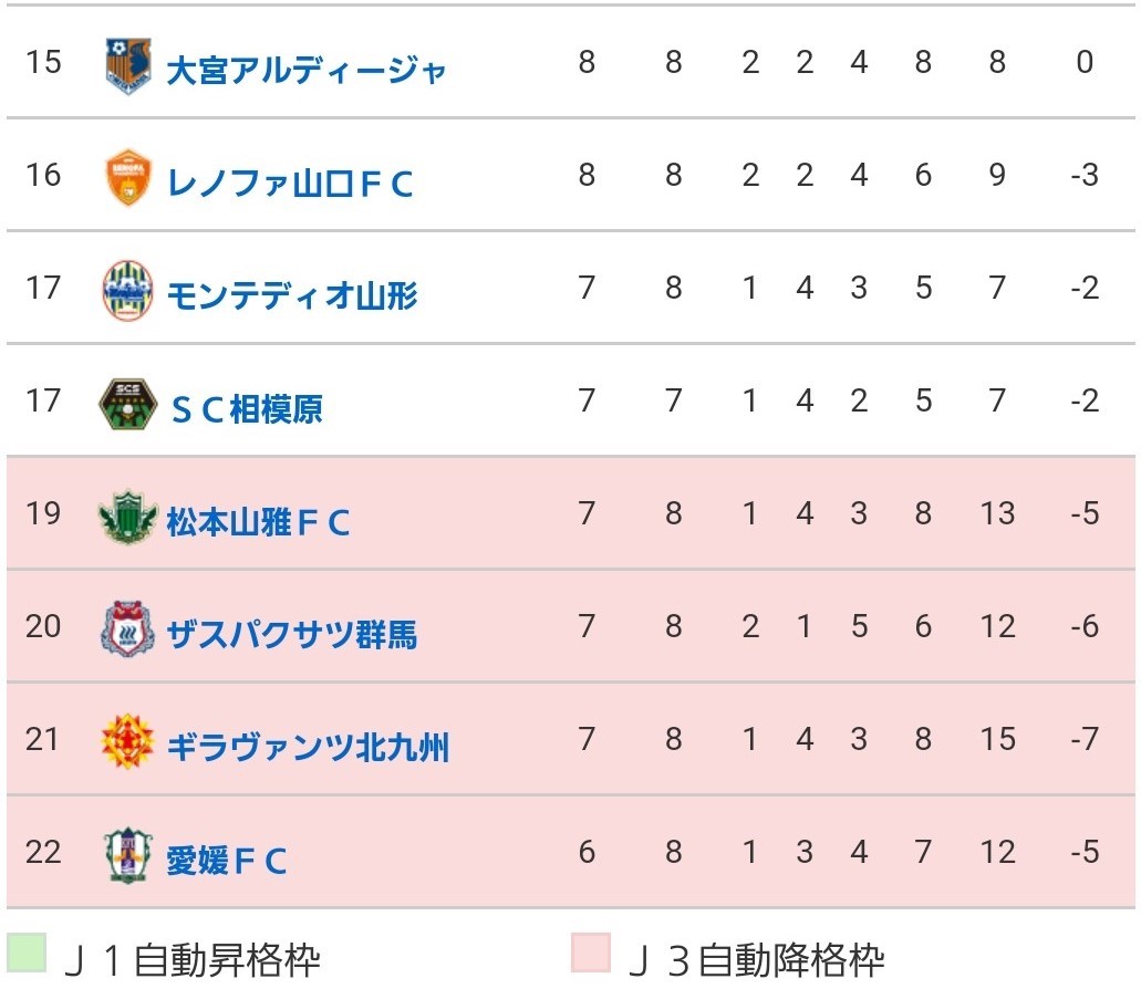 勝ち点3を得て順位が一気に5つ上がりましたが、最下位との勝ち点差は2しかありません。。まだまだ団子状態と言ったところです。