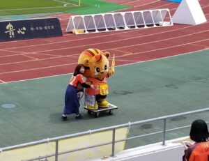 椹野(ふしの)川河川敷の臨時駐車場に車を停めて徒歩でスタジアムへ。近づくにつれてオレンジのユニフォームが増えていきます。