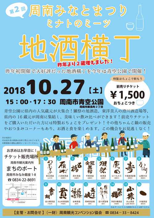 2018年10月27日(土)に、徳山駅近くで行われる地酒横丁イベントでは徳山の酒蔵3社も含めた山口県内の酒蔵16社が一挙に集合!