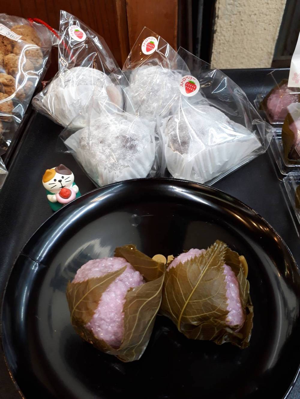 季節のお菓子、桜餅やいちご大福。黒米いなり。田原清光園茶舗さんとコラボの抹茶のお菓子をお届けします。