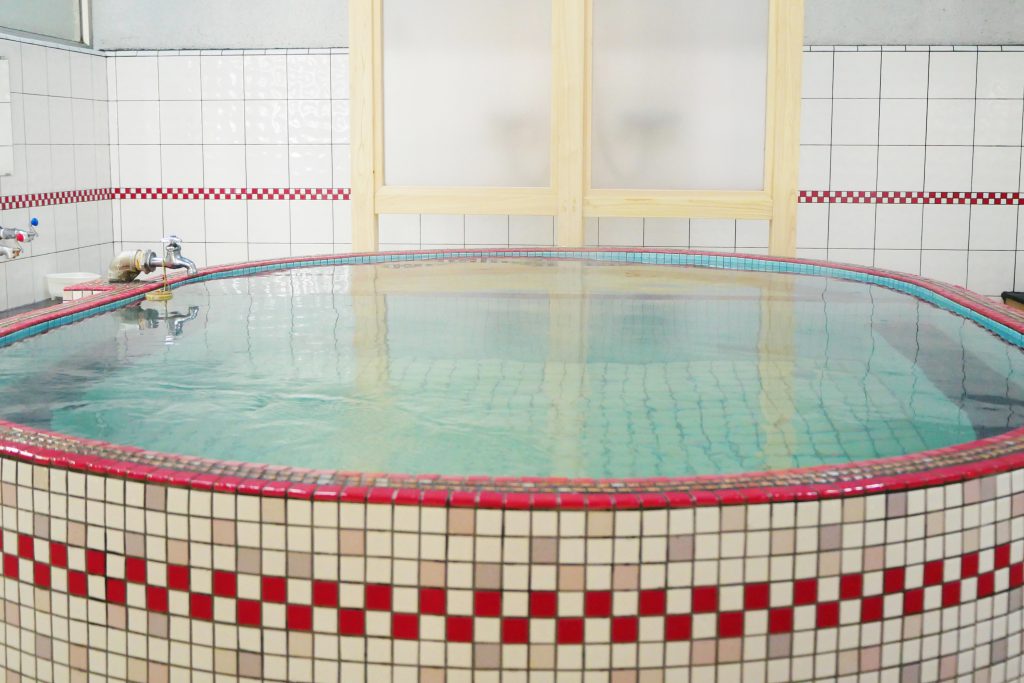男湯、女湯ともに、この大きな浴槽が真ん中にどーんと設置されています。2017年にリニューアルをして可愛らしいタイルを張り替えられた大きな浴槽に、満々とあふれる清潔なお湯!ああ、今すぐどっぷりと身を浸したい!