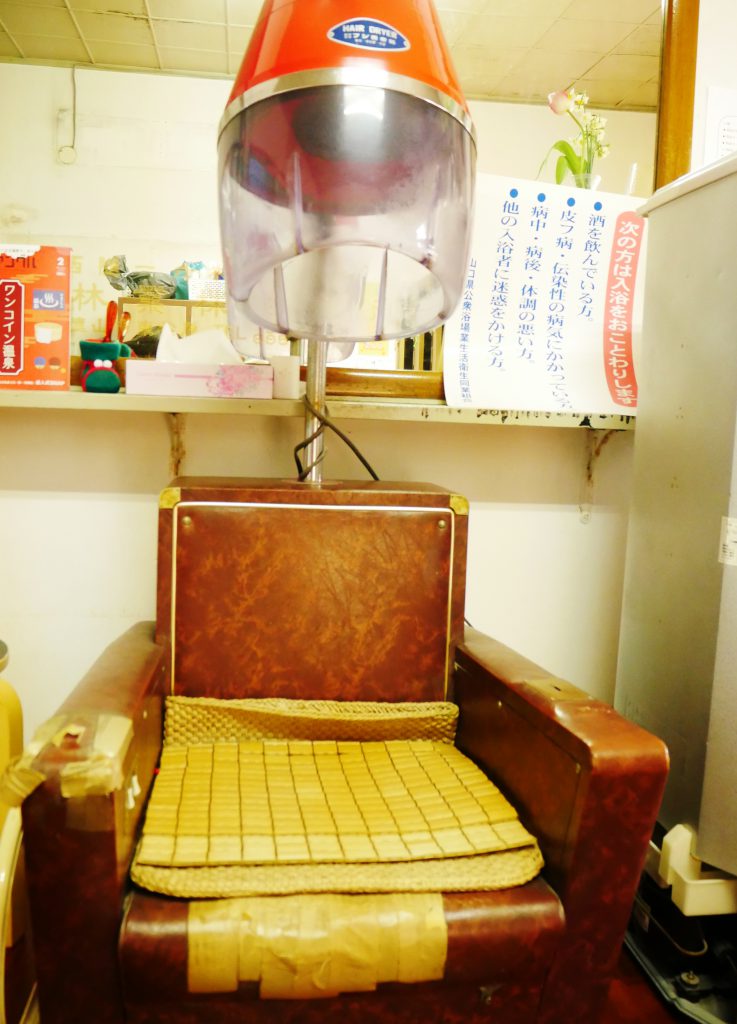 現役で活躍中のおかま型ヘアドライヤー。20円入れるとちゃんと動きます。今ではメーカーがないので、故障はご主人自ら修理されてるとか。