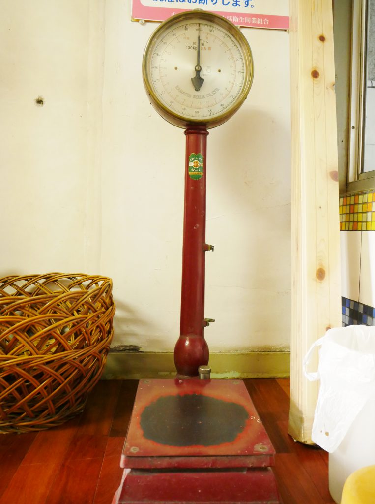 女湯にある体重計。足を乗せるところに年季が入ってます。