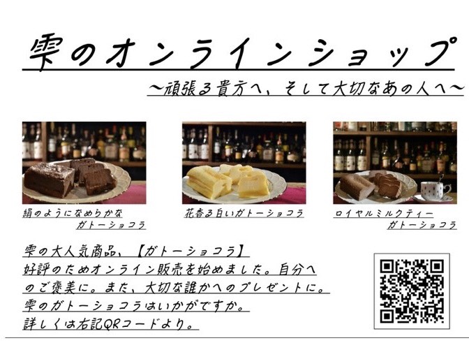コロナのご時世で外出が怖いという人、家でも雫のガトーショコラが食べたいという人は、是非QRコードまたは下記よりアクセスしてみてください。