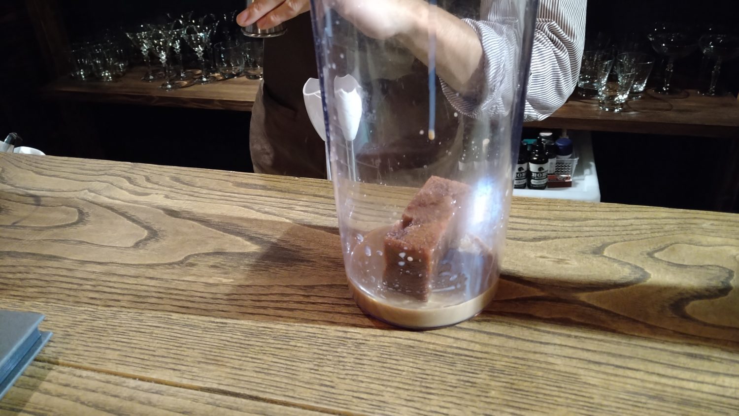カクテルの材料として、文字通りガトーショコラを丸々一個使って作ってます。そしてグラスの底にはザクロのシロップが加えられ、バラの花びらが添えられてあります。
