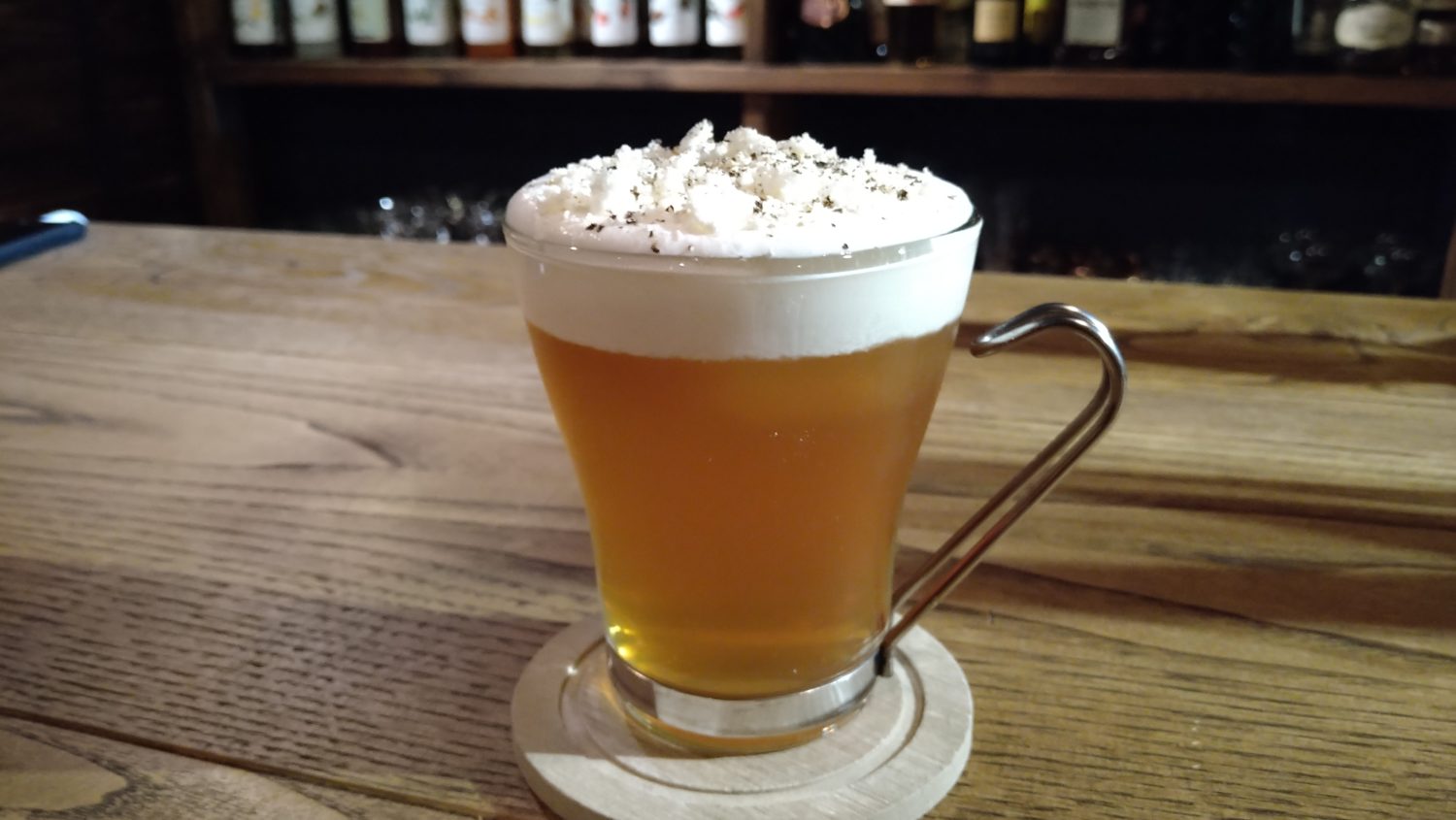 紅茶とグレープフルーツで作られるカクテルで、上には生クリームとクリームチーズが加えられ、黒胡椒が振りかけられています。