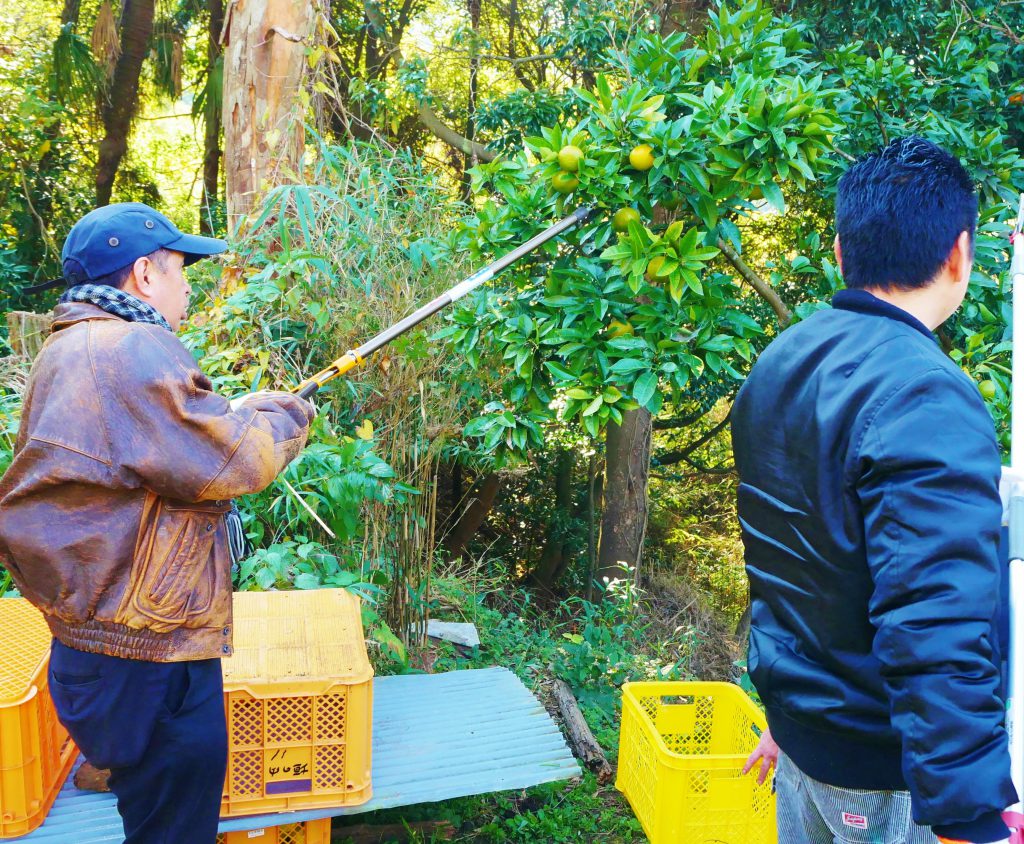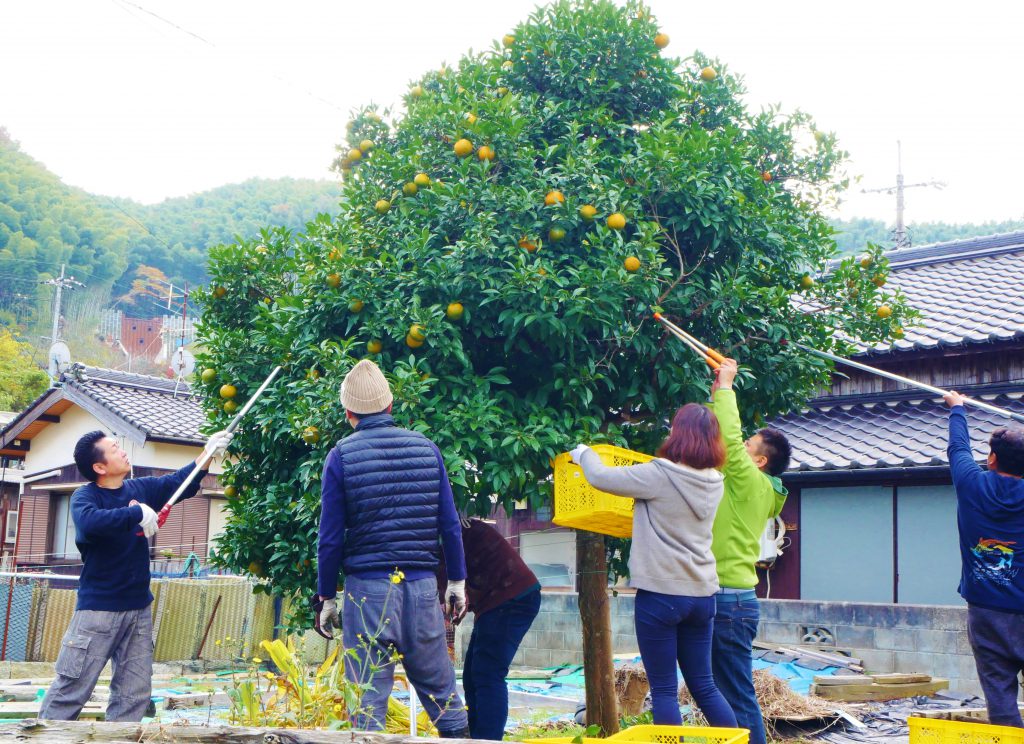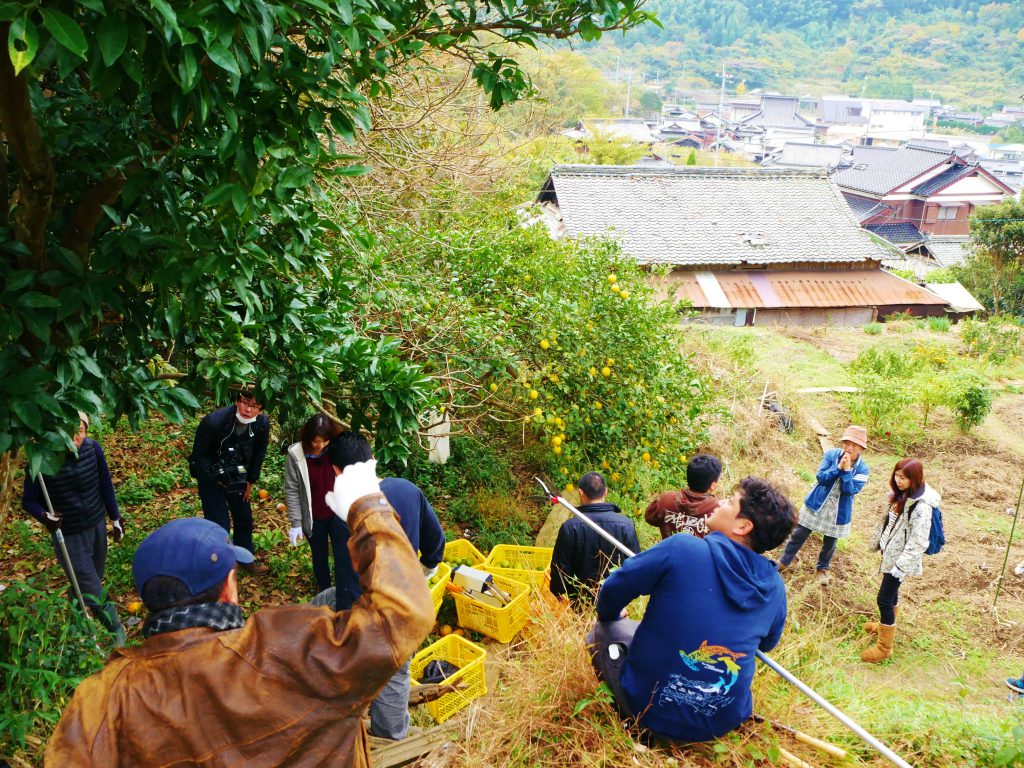 集落と港を見下ろす小高い場所が、1か所目の収穫場所。全員で収穫スタートです。とっているとすだいだいの爽やかな香りがあたりに立ち込めてきます。