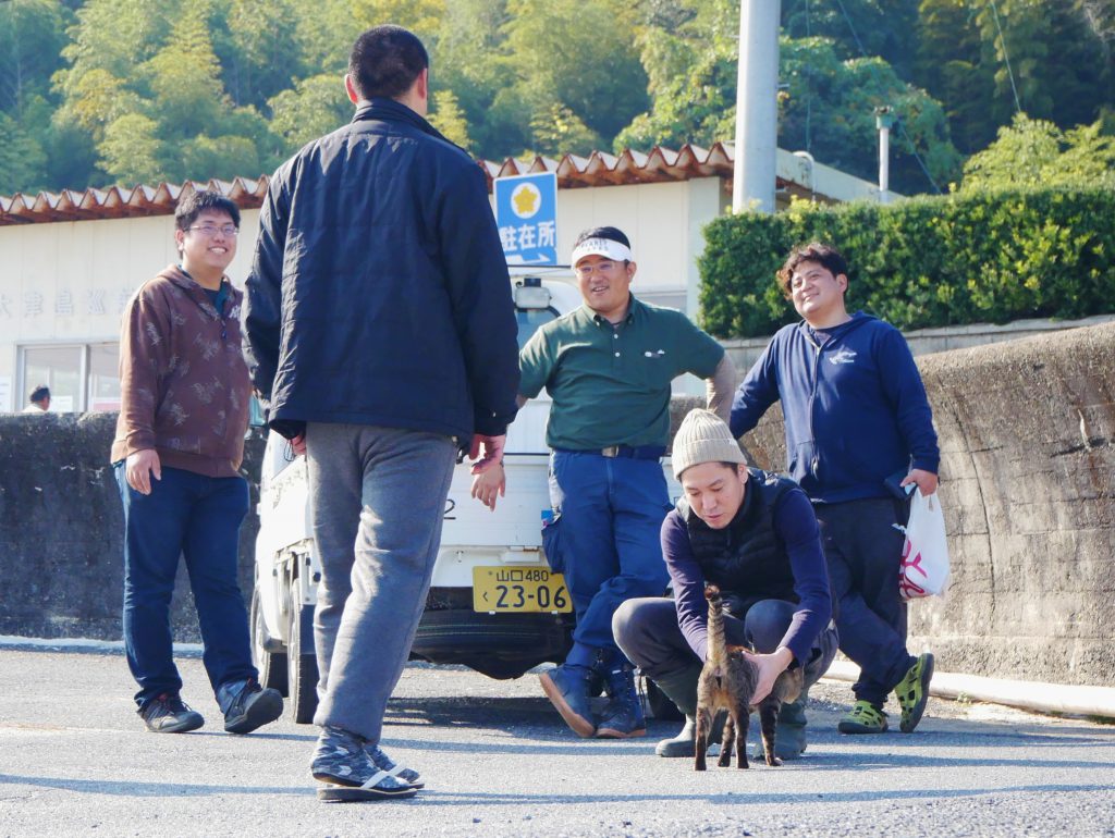 ひと仕事終えてくつろぐ男性陣。何事かと猫もやってきました。