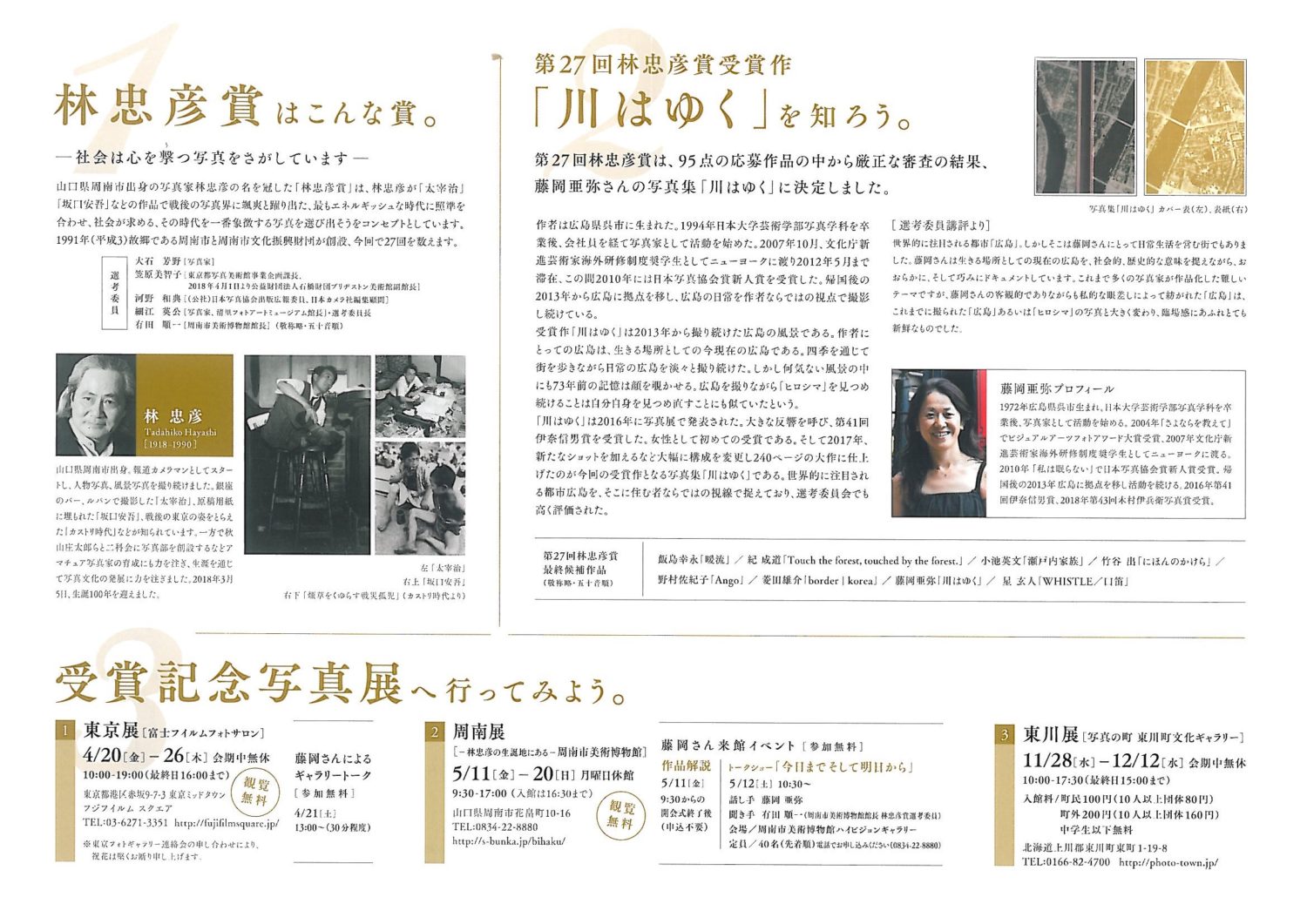 周南市出身の写真家林忠彦の名を冠した林忠彦賞。そのキャッチフレーズは「社会は心を撃つ写真をさがしています」。林忠彦が生まれて100年の記念の年となった今回の受賞作品は、藤岡亜弥さんの「川はゆく」。95点にもおよぶ応募作品の中から選ばれました。