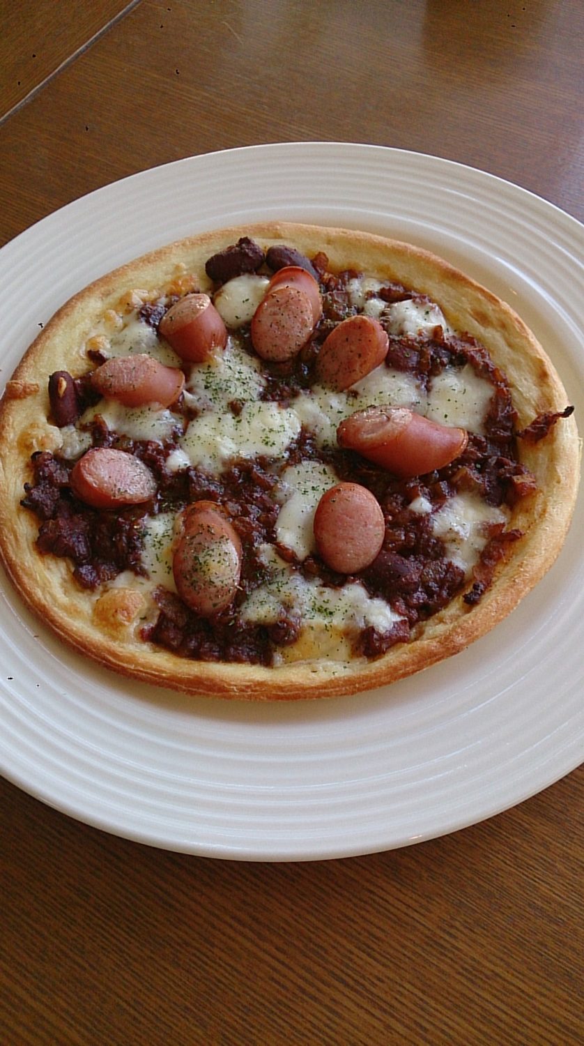 (おからサラダ、自家製ピクルス付き) - チリビーンズのもっちりピザ 1020円