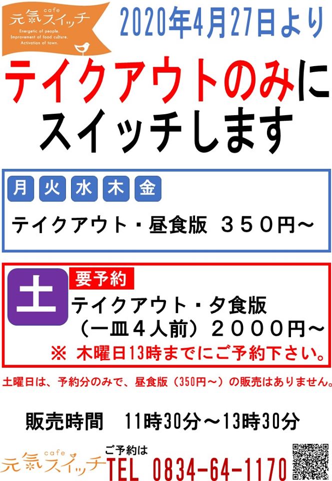 ランチは11時からで日替わりです。テイクアウトメニューの販売は、ランチの準備もありますので11時30分とさせていただいております。ご予約は、お電話(0834-64-1170もしくは店頭で受け付けております。グループや団体でのご予約もご相談下さい。