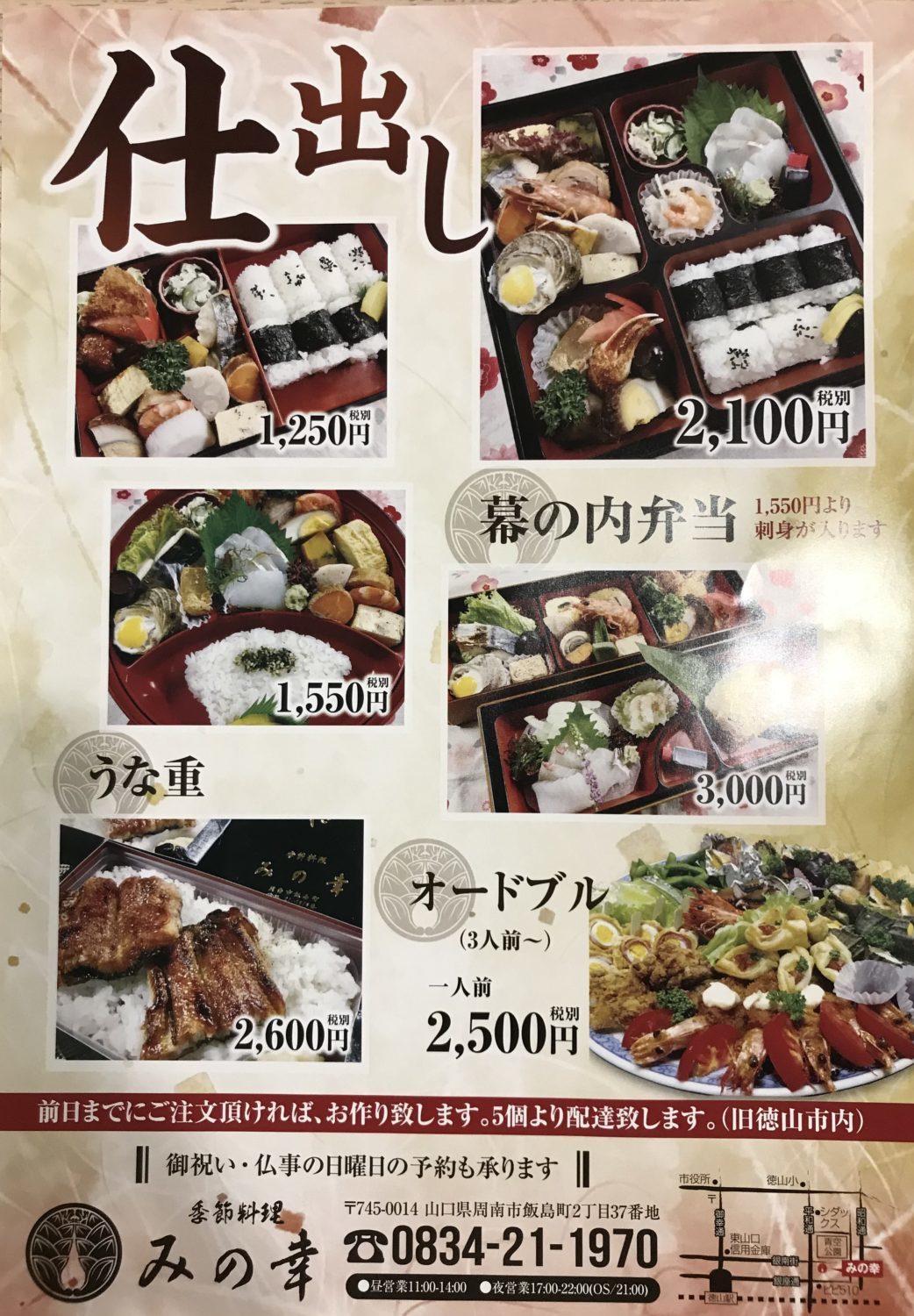 お弁当に限り、5個以上の注文で旧徳山市内なら配達可能。