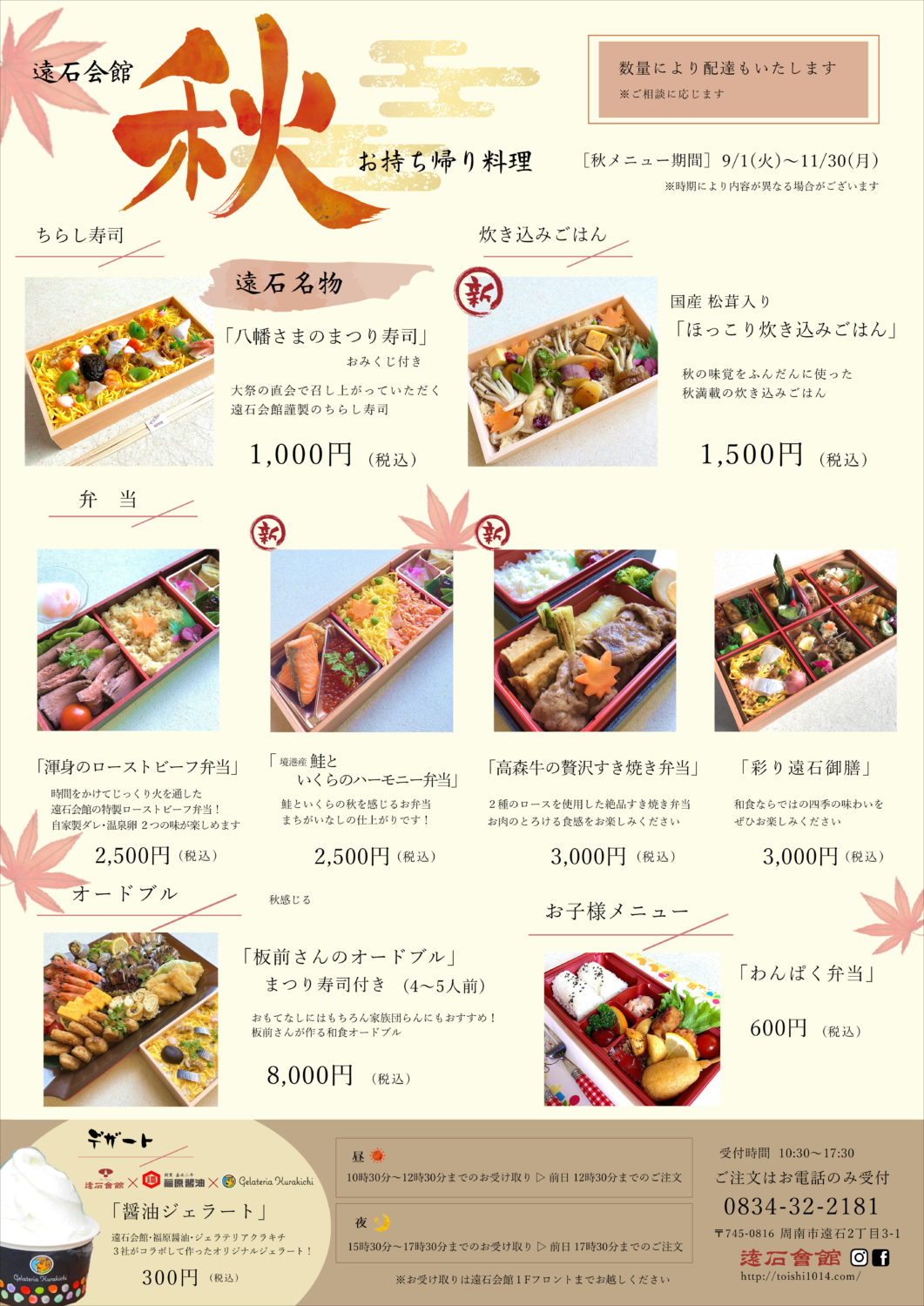 『遠石会館のテイクアウトサイト(外部サイト:Take Eats)』は下記よりお申し込みください。TakeEatsとは?