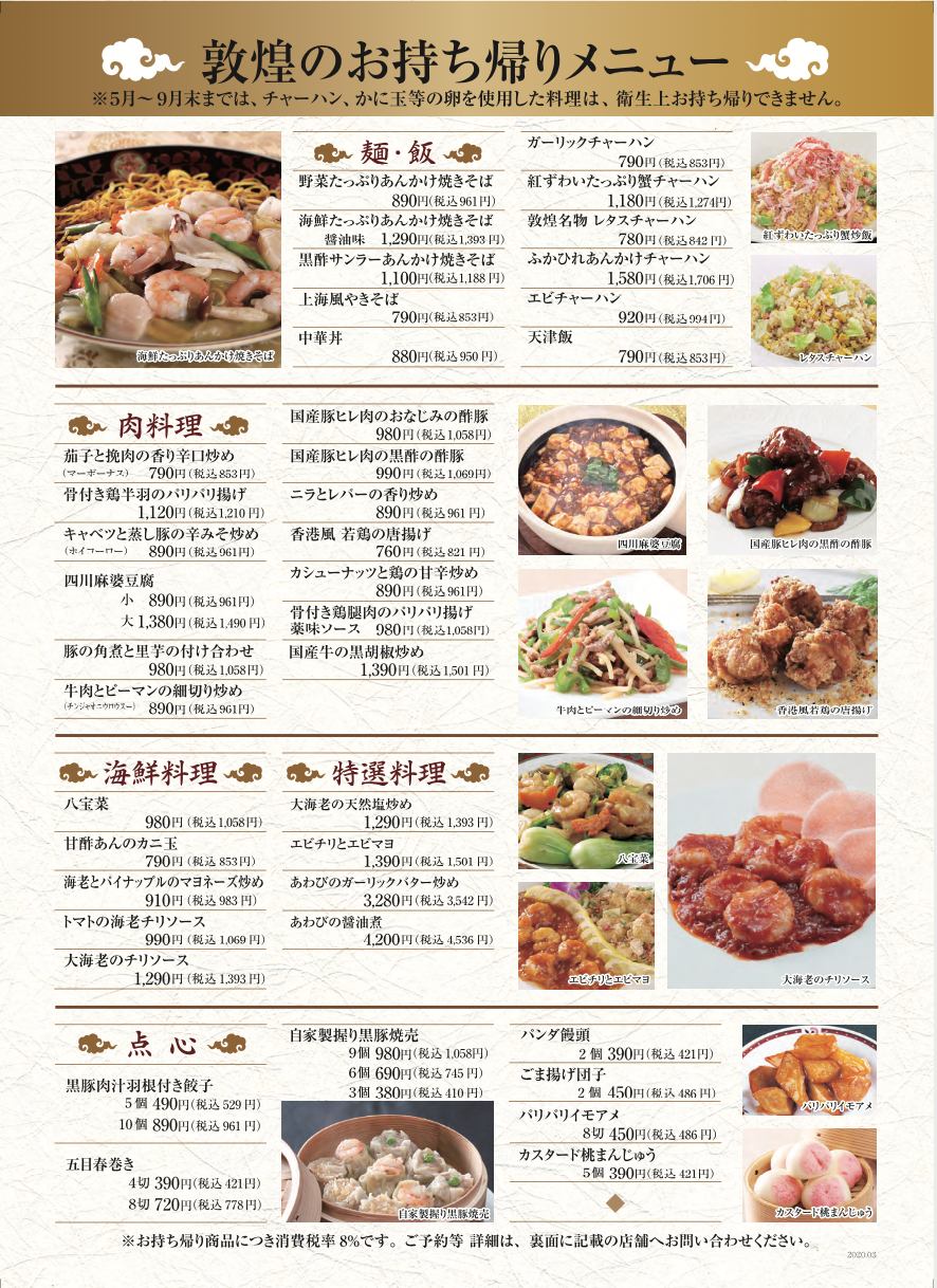 ※5月~9月は卵を使用した料理のテイクアウト、デリバリーは行っておりません。