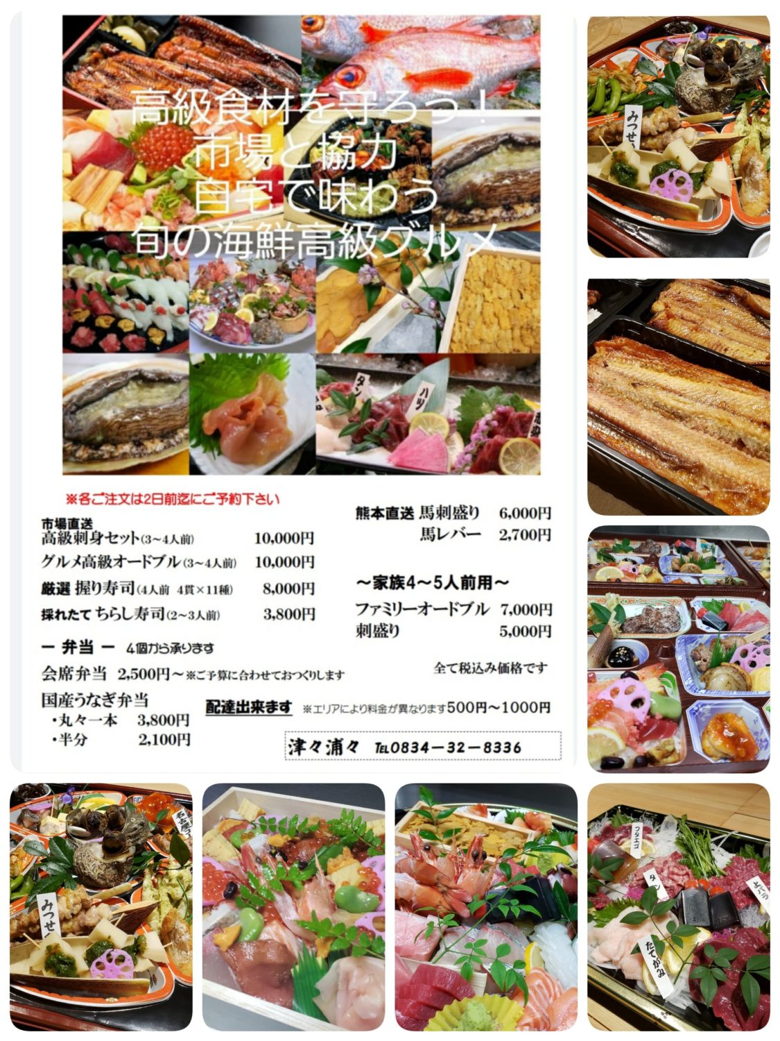 津々浦々はテイクアウトを行っています。 『津々浦々のテイクアウトサイト(外部サイト:Take Eats)』は下記よりお申し込みください。TakeEatsとは?