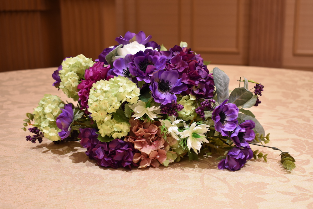 テーブルには可愛いフラワーアレンジメントの花があり、結婚式気分♪