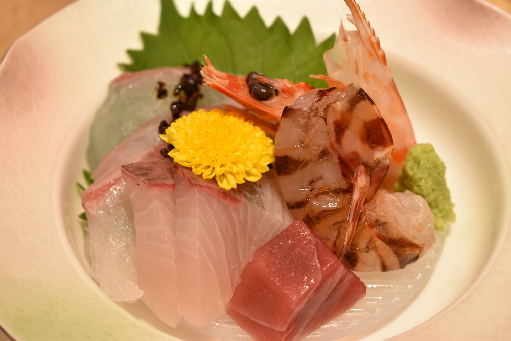 左)御寿物:徳山河豚薄造り/右)御造り:鯛昆布〆、車海老、勘八平造り、本鯛